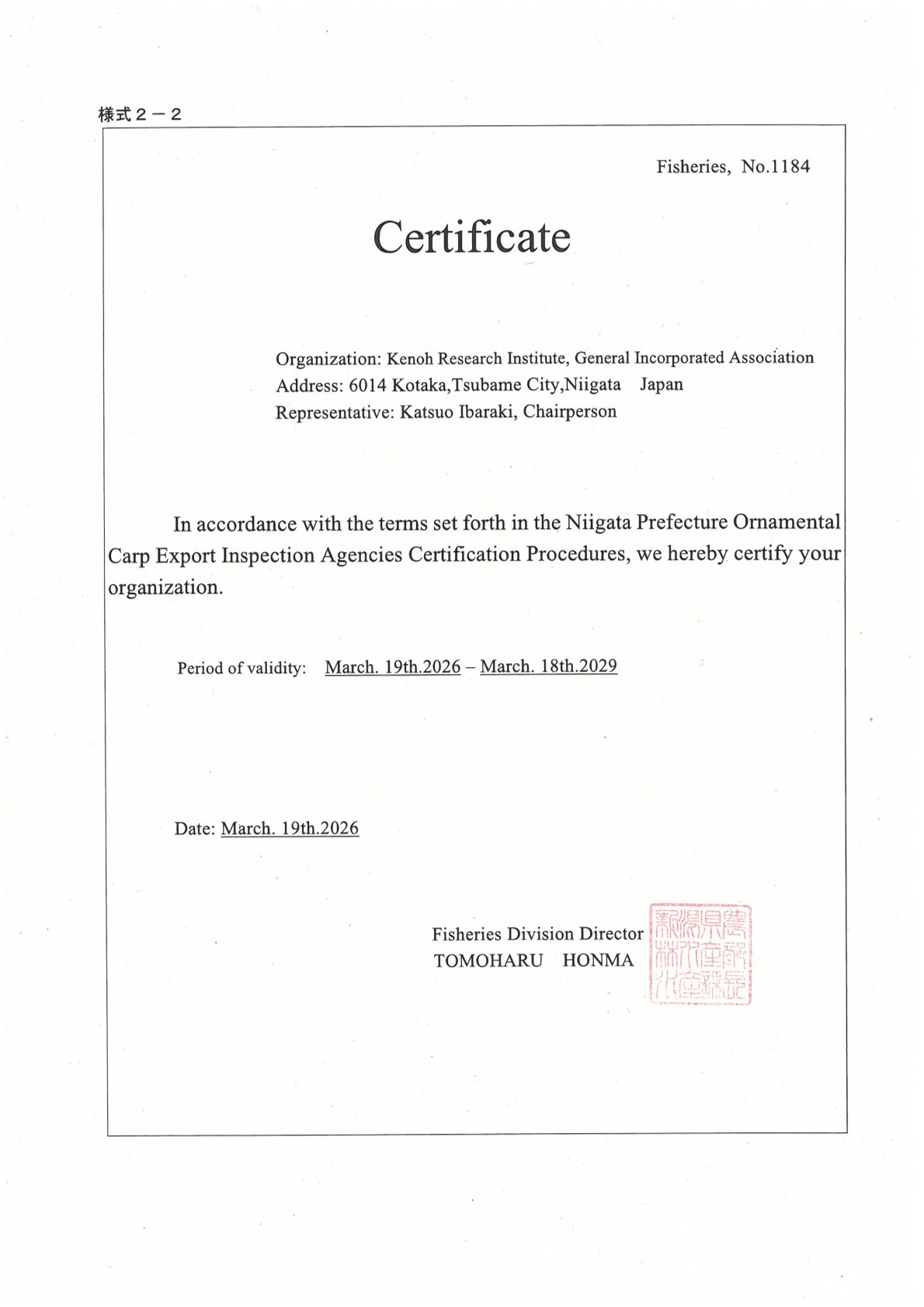 このたび、新潟県輸出錦鯉検査機関の認定をいただきました。